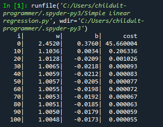 위 그래프에서 보이듯이, W와 b가 각각 2.9와 0.5일 때 오차가 꽤나 큰 것으로 보입니다. 실제로 결괏값에서 초기 cost는 45.66으로 굉장히 큰 것을 알 수 있습니다.