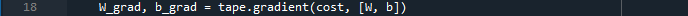 4.1. W_grad, b_grad = tape.gradient(cost, [W, b])는 cost에 대해 tape에 저장된 변수(W, b)를 미분한 값을 튜플로 반환하여 W_grad, b_grad에 순서대로 저장합니다.