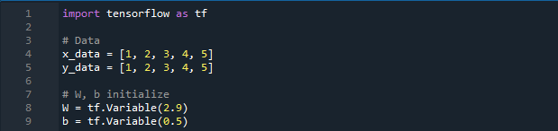 위 데이터는 입력과 출력이 같기 때문에, 우리는 H(x) = Wx + b에서 W와 b가 1, 0이라고 예측할 수 있습니다. 다음의 텐서플로우 코드로 확인해보겠습니다.