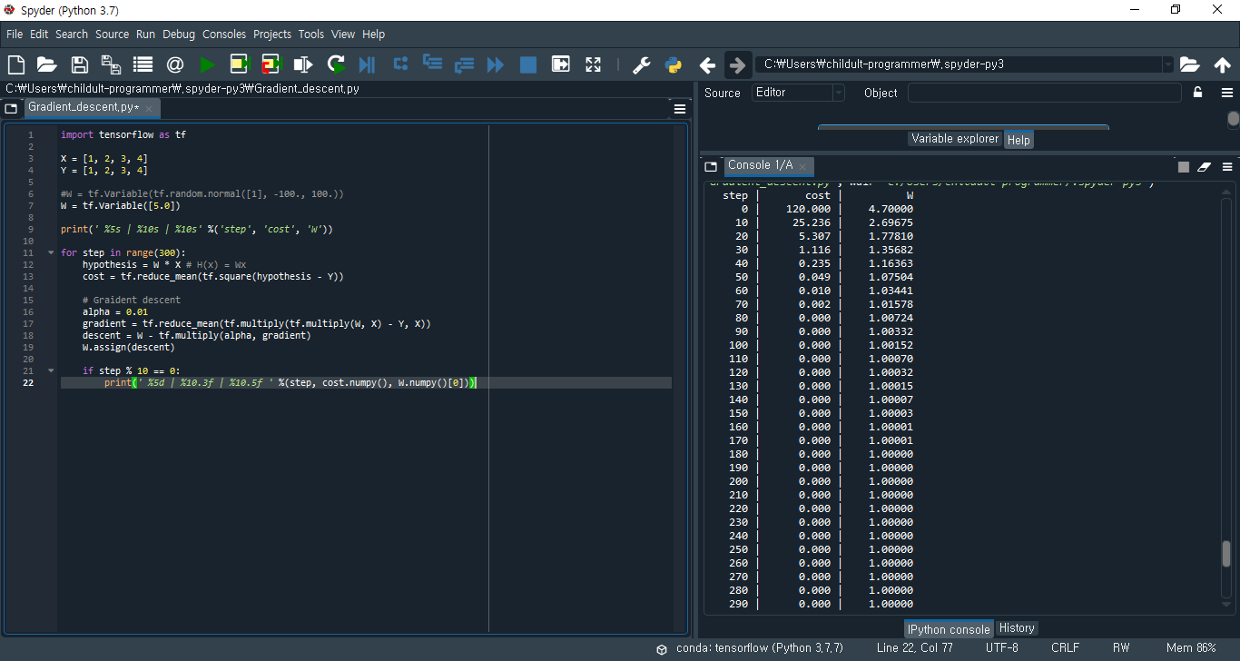 이렇게 우리는 텐서플로우 코드로 Gradient descent를 구현하는 방법을 알아보았습니다. 이제 실제로 W, X, Y에 값을 주고 실행해서 W와 cost의 변화를 살펴보겠습니다. 먼저 코드를 보겠습니다.