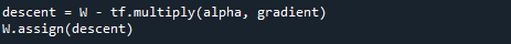 3. 이제 1,2에서 구한 값을 곱하여 W에서 뺀 값을 다시 W에 할당하겠습니다. 텐서플로우의 assign() 메서드를 이용하여 값을 할당해주는 작업을 합니다.