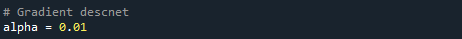 1. 먼저 α값을 정합니다. α는 learning rate(학습 속도)로 보통 0.001, 0.00001 등의 작은 값을 사용하지만, 이번에는 값의 변화를 조금 더 빨리 보기 위해 0.01로 정하겠습니다.