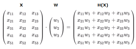 우리는 이 행렬의 내적을 H(X) = XW으로 표현할 수 있습니다. 그런데 위의 행렬의 내적을 살펴보면 수식1.1과 조금 다른점을 알 수 있습니다. 관례적으로 수식에서는 가중치 w가 변수 x 앞에 오지만, 행렬에서는 "행렬 X에 대한 H(x)를 찾는다"는 의미에 맞춰 X가 W앞에 옵니다. 만약 X가 행벡터이고 W가 열벡터인 경우 H(X) = WX로 표현하는 것은 잘못된 표현입니다. 그렇다면 이제 실제 데이터를 보고 행렬을 이용해 Hypothesis를 표현해보겠습니다.
