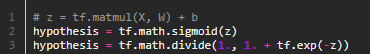 위는 바로 전에 말한 Sigmoid function, g(z) = 1 / (1 + e^(-z))를 표현한 그래프입니다. 식에서 z -> ∞일 때 g(z)는 1로 수렴하며 z -> -∞일 때 g(z)는 0으로 수렴합니다. 또한 정확히 표시되진 않았지만 위 그래프에서 특정 데이터가 Pass인지 Fail인지를 구분하는 경계는 0.5이며, 이 경계를 Decision boundary라고 합니다. 그렇다면 Logistic Regression에서 Hypothesis를 텐서플로우에서 어떻게 구현하는지 간단한 코드를 보며 살펴보겠습니다.