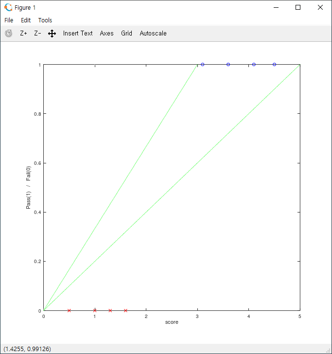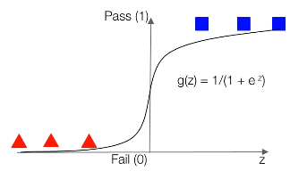위는 score에 따른 Pass(1)와 Fail(0)을 나타낸 그래프입니다. 그래프에서 빨간색으로 표시된 x와 파란색으로 표시된 o는 Fail과 Pass를 나타냅니다. 이때 Fail과 Pass의 경계가 되는 score는 2-3 사이인 것으로 보입니다. 이 데이터들을 대변하는 Hypothesis는 기존의 H(x)로는 힘들어 보입니다. 실제로 데이터들이 연속적이지 않고 0 또는 1로 이분적이기 때문에 초록색으로 그은 Hypothesis는 데이터들을 잘 대변하는 것 같지는 않아 보입니다. 따라서 우리는 데이터들을 대변할 수 있는 새로운 함수가 필요합니다. 새로운 함수는 Sigmoid function이라 하고 g(H(x)) 혹은 g(z)로 표현됩니다. 아래 그래프를 보겠습니다.