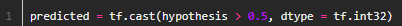 먼저 왼쪽의 그래프는 Decisioin boundary가 검은색 실선으로 표시되어있습니다. w가 행 백터 [-3, 1, 1]이라고 했을 때(위 그림에서 x0는 생략되었지만 행렬곱을 위해 x0 = 1로 가정합니다.) 위 그래프의 Decisioin boundary는 x1 + x2 = 3입니다. 오른쪽 그래프에서 Decision boundary는 원형의 검은색 선으로 w가 행 벡터 [-1, 0, 0, 1, 1]이라고 했을 때 x1^2 + x2^2 = 1로 표현할 수 있습니다. 그렇다면 마지막으로 텐서플로우에서 Decision boundary를 활용하여 1, 0과 같은 결괏값을 얻는 코드를 보겠습니다. 코드는 tf.cast() 메서드를 활용하여 가설이 Decision boundary보다 큰 경우 1, 작은 경우 0을 반환하도록 작성되었습니다.