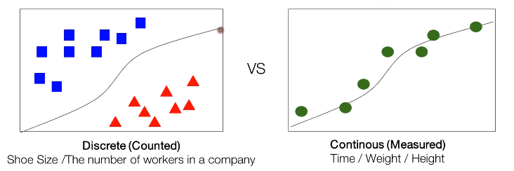 반면 Linear Regression에서는 데이터들이 연속적이고, 측정할 수 있다는 특징을 가지고 있습니다. 데이터를 이은 선은 데이터를 가장 잘 대변하는 Linear Regression의 Hypothesis입니다. 시간, 몸무게, 키 등은 연속적인 값으로 표현하며 이들은 선형 회귀의 대표적인 예시입니다.