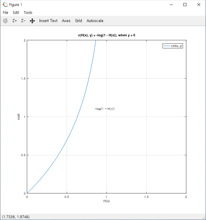 위 식을 보면 y값에 따라 c(H(x), y)가 다르게 정의됩니다. 먼저 y = 1 일 때의 c(H(x), y) 그래프를 보겠습니다.