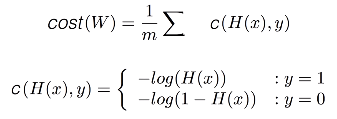 아래의 C(H(x), y) = -ylog(H(x))... 는 위의 수식을 한 줄로 표현한 수식으로, 마찬가지로 y의 값에 따라 C(H(x), y)가 정의됩니다. 이렇게 cost function을 한 줄로 표현함으로써 바로 뒤에서 배우는 Gradient descent를 편리하게 사용할 수 있고 텐서플로우 코드를 보다 보기 좋게 작성할 수 있습니다. 실제로 텐서플로우에서 cost function을 구현하는 코드에 대해서는 다음 포스트에서 알아보겠습니다.