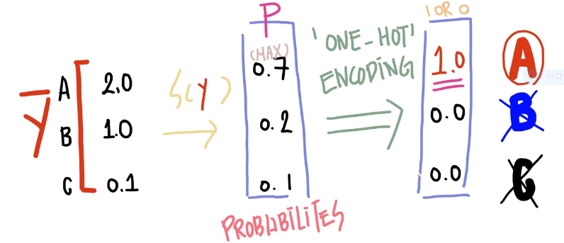 위의 그림 1에서 H(X) = WX를 계산해 Ŷ(A, B, C)에 상응하는 벡터로 (2.0, 1.0, 0.1)을 구했다고 가정해보겠습니다. 하지만 우리는 이 값들을 1. 0 <= P <= 1, 2. ∑P = 1, 이 두 조건을 만족하는 확률의 형태로 표현하는 것을 원합니다. 이처럼 값을(score) 확률로(to probability) 바꿔주는 것이 바로 Softmax function입니다. 그림 1에서 Softmax function hypothesis을 볼 수 있습니다.