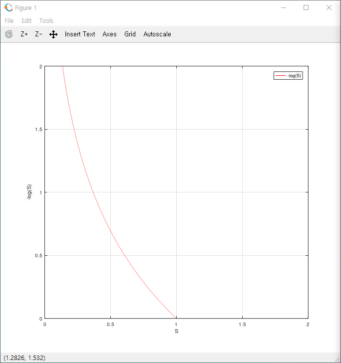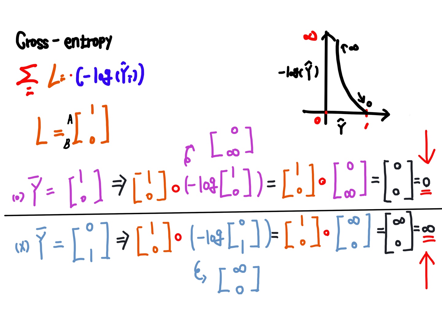 먼저, 벡터 L과 벡터 Ŷ(위)를 계산하는 과정을 보겠습니다. -log(Ŷ)는 1일 때 0에 수렴하고, 0에 가까워질수록 무한대(∞)로 발산하는 모양을 보입니다(아래 그래프 1.1 참조). 따라서 -log에 Ŷ벡터 [1 0]을 넣으면 [0 ∞]으로 계산되고, 이 요소와 L벡터의 요소를 아다마르 곱하면 영 벡터가 나옵니다. 이 벡터를 총합(∑)한 값이 바로 Softmax classification의 cost입니다. cost가 0인 것으로 보아 벡터 Ŷ(위)는 예측값이 실제값과 동일하다고 볼 수 있겠습니다. 매우 좋은 예측이라고 할 수 있습니다.