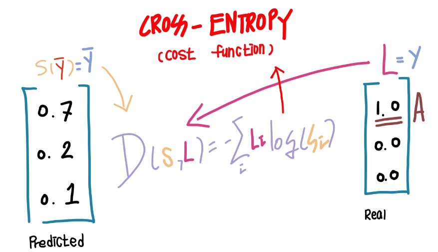 이후 Softmax()를 통해 얻은 벡터 P를 One-hot encoding을 사용하여 1과 0으로 나타냅니다. 위 그림의 과정을 순차별로 살펴보겠습니다. 먼저 그림의 벡터 P는 Ŷ(A = 2.0, B = 1.0, C = 0.1)를 softmax()에 넣어 얻은 벡터로, (0.7, 0.2, 0.1)의 확률 값을 가집니다. 이 벡터 P를 One-hot encoding(표현하고 싶은 값에 1을 부여하고, 다른 값에는 0을 부여하는 벡터 표현 방식입니다)을 사용해 가장 큰 값(0.7)에 1을, 나머지 값(0.2, 0.1)에 0을 정합니다. 최종적으로 우리는 One-hot encoding 된 값을 참조하여 하나('A')를 선택할 수 있습니다. 다음은 Softmax의 Cost function인 Cross-entropy에 대해 알아보겠습니다.