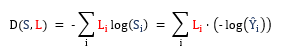 위 그림은 Softmax의 Cost function인 Cross-entropy에 대해 설명하고 있습니다. softmax를 통해 구한 예측값(왼쪽) S(Ŷ)을 S, One-hot encoding 된 실제값(오른쪽)을 L로 놓은 채 cost function을 구하면 위 그림의 식(Cross-entropy)을 얻을 수 있습니다. 그렇다면 cost function이 왜 이런 식으로 도출되는지 알아보겠습니다. 먼저 Cross-entropy 식을 다시 보겠습니다.