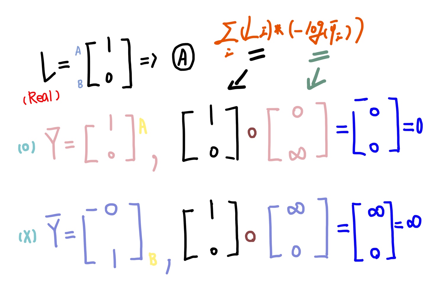 반대로 위와 같은 순서로 벡터 L과 벡터 Ŷ(아래)를 계산하면 cost가 무한대(∞)로 발산하는 굉장히 큰 값을 갖습니다. 따라서 이러한 경우는 벡터 Ŷ(아래)가 예측값이 실제값과 동떨어진, 잘못된 예측을 하고 있다고 볼 수 있겠습니다. 벡터 Ŷ(위)와는 다르게 매우 나쁜 예측이라고 할 수 있습니다.