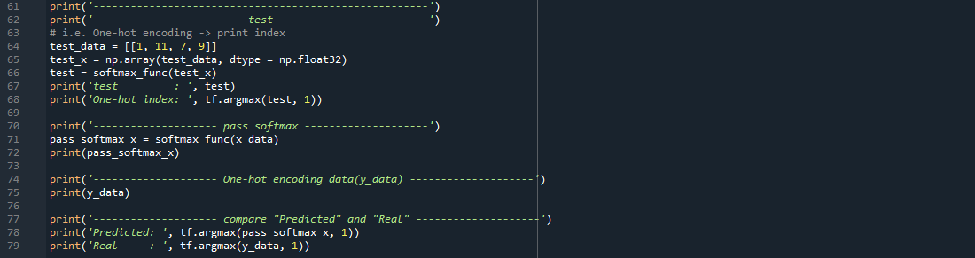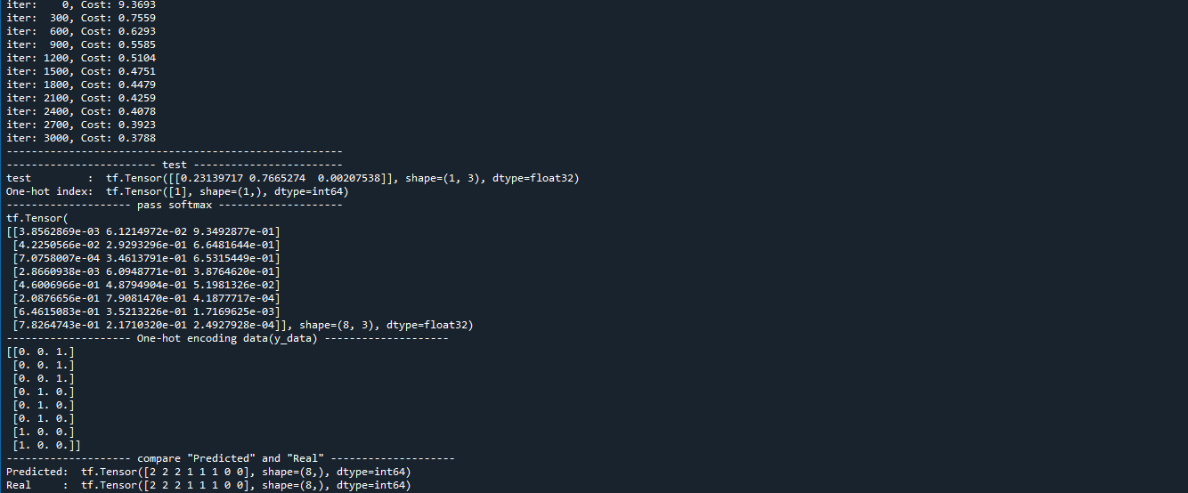 코드 2.1은 One-hot encoding의 과정을 보여주고 있습니다. One-hot encoding은 가장 큰 값을 1(TRUE), 나머지 값을 모두 0(FALSE)으로 하는 인코딩을 말합니다. 텐서플로우에서 tf.argmax()를 사용하여 쉽게 표현할 수 있는데, 위 코드의 line 61 - 68에서는 test_data에 대한 tf.argmax()를 구해(첫 번째 인자에 입력값(1x4 행렬), 두 번째 인자에 차원(2차원 배열에 대해서는 axis = 1)을 넣습니다) 가장 큰 값의 인덱스를 출력합니다. 같은 방법으로 line 70 - 79에서는 softmax_func(x_data)에 대한 One-hot encoding값과 y_data(이미 One-hot encoding 된 값입니다)를 비교하여 출력하고 있습니다. 물론 W와 b가 랜덤한 값을 갖는 배열이기 때문에 실행에 따라 tf.argmax(pass_sotfmax_x, 1) 값은 항상 바뀝니다. 아래는 실행결과를 보여줍니다.