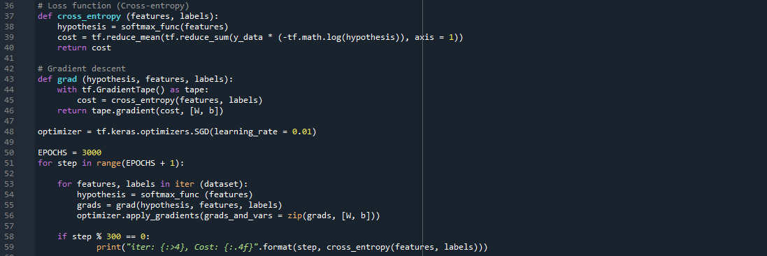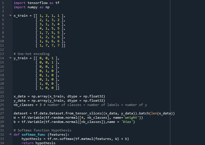 이번 포스트는 텐서플로우에서 Softmax Classification의 Hypothesis와 Cross-entropy, 그리고 Gradient descent를 구현해보고, Epoch에 따른 cost의 변화를 살펴보겠습니다. 전체적으로는 저번 포스트의 Logistic Regression의 코드와 유사하지만, 이번 포스트에서 주목할 점은 tf.argmax()를 통해 One-hot encoding을 구현하는 코드입니다.
