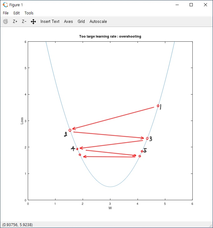 먼저 learning rate가 너무 작은 경우입니다. learning rate가 너무 작으면 아래 그래프 1.2에서처럼 최솟값에 도달하는 데에 너무 많은 학습이 필요합니다. 따라서 최솟값에 도달하기까지 시간이 오래 걸리고, 최악의 경우에는 정한 Epoch 내에 최솟값에 도달하지 못해 지역적 최솟값(local minimum)에서 멈출 수도 있습니다. 이렇게 되면 우리는 이 지역적 최솟값을 전역적 최솟값(Global minimum)으로 착각하여 기대했던 결과와는 전혀 다른 결과를 얻을 것입니다. 결국 learning rate가 너무 작을 때는 단순히 시간이 오래 걸리는 것에 그치지 않고, 결과에 영향을 주어 잘못된 결과를 얻을 수도 있기 때문에 값을 조정할 필요가 있습니다.