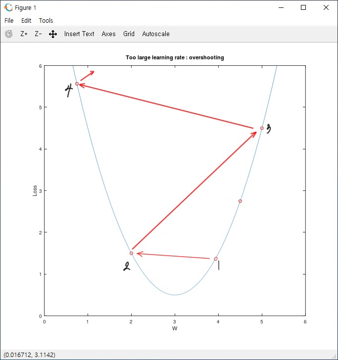 이번에는 learning rate가 너무 큰 경우입니다. learning rate가 크다는 것은 한 번의 Epoch에 값이 크게 변한다는 의미입니다. 아래의 그래프 1.3은 흔하지는 않지만 learning rate가 커서 cost값이 반대편으로 이동하다가, 어느 순간 cost값이 좌우로 반복하는 모습입니다. 반면 아래의 그래프 1.4는 learning rate가 너무 커서 cost가 줄어들기는커녕 학습할수록 늘어나는 모습을 보입니다. 결국 아래의 두 그래프는 cost가 최솟값에 도달하지 못해 잘못된 결과를 얻을 수 있다는 것을 보여줍니다.