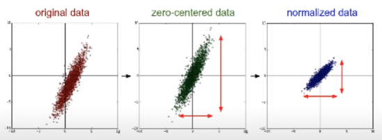위의 그래프 3.1은 원래의 데이터(original data)에서 데이터의 중심을 0에 맞춰 이동하는 방법(zero-centered data, 모든 데이터 각각에 대해 평균값만큼 차감하는 방식으로 구현됩니다)과 데이터 범위를 어떤 범위에 항상 들어가도록 조절하는 방법(normalization, 자동으로 zero-centered data가 됩니다)으로 Data processing의 두 예시를 보여줍니다. 아직 이해가 되지 않으신다면, 아래의 링크 사이트에서 자세한 설명을 확인하시길 바랍니다.