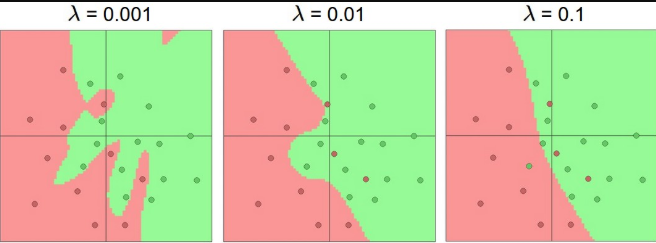 식 3.1에서와 같이 Regularization은 cost function에 (lambda)*(∑w^2)값을 더하여 구현합니다. 그런데 (∑w^2) 값은 정해져 있어 사실상 lamda(regularization)에 따라 모델이 바뀌기 때문에 lambda값의 크기가 regularization을 얼마나 많이 적용할 것인지를 판단한다고 해석할 수 있습니다. 아래 그림은 lambda값에 따라 실제로 모델이 얼마나 변하는지를 보여줍니다. 텐서플로우에서는 아래와 같이 아주 간단한 코드로 구현할 수 있습니다.