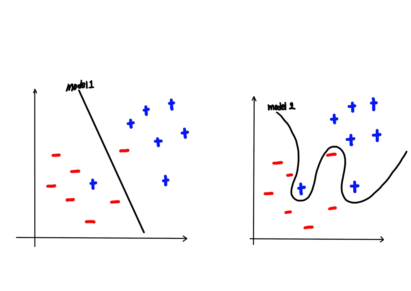그래프 4.1(좌)은 학습 데이터(+, -)를 구분 짓는 적절한 모델을 가지고 있습니다. 물론 학습 데이터를 완벽히 구분짓지는 않지만, 새로운 데이터가 들어왔을 때 데이터가 (+)인지 (-)인지를 구분하기에 적절한 가설을 가지고 있기 때문에 일반적이고 좋은 모델이라고 할 수 있습니다. 반면 그래프 4.2(우)는 학습 데이터를 완벽히 구분하기 위해 모델이 굽어진 모양을 볼 수 있습니다. 이러한 모델은 학습 데이터만 놓고 보았을 때는 최적의 모델이라고 할 수 있지만, 새로운 데이터들이 들어왔을 때는 cost값이 커질 가능성이 왼쪽에 비해 높습니다. 이렇듯 학습 데이터에만 맞춰 무리하게 모델을 설정한 것은 실제로 사용하기에 어렵기 때문에 특수하고 좋지 않은 모델이라고 할 수 있습니다. 따라서 이와 같은 경우를 우리는 overfitting(과적합)이라고 합니다.