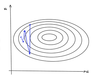 그렇다면 아래의 데이터(x1, x2, y)를 토대로 등고선 그래프를 그리면 어떤 모양이 나올까요? x1, x2를 각각 w1, w2와 곱해 합한 값을 최소화하기 위해 범위가 좁은 x1과 곱하는 w1은 조금 더 큰 값이 될 것이며 반대로 범위가 넓은 x2와 곱하는 w2는 조금 더 작은 값이 될 것입니다. 따라서 그래프를 그려보면 아래와 같이 양옆으로 길쭉한(한쪽으로 치우친) 모양으로 나타납니다.
