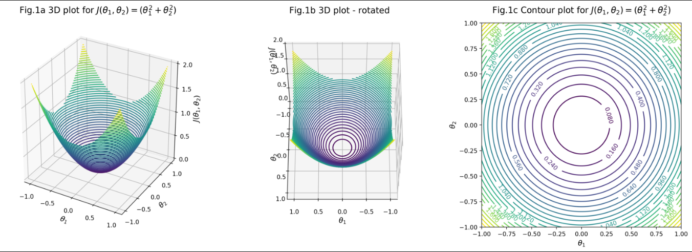 그래프 2.1에서 알 수 있듯 cost를 최소로 하는 값은 등고선 그래프의 중앙입니다. 따라서 cost를 최소화한다는 것은 그래프의 어느 한 점에서 시작하여 그래프 중앙으로 이동하는 것을 의미합니다. 아래 그림 1.2는 이 과정을 그림으로 표현하고 있습니다.