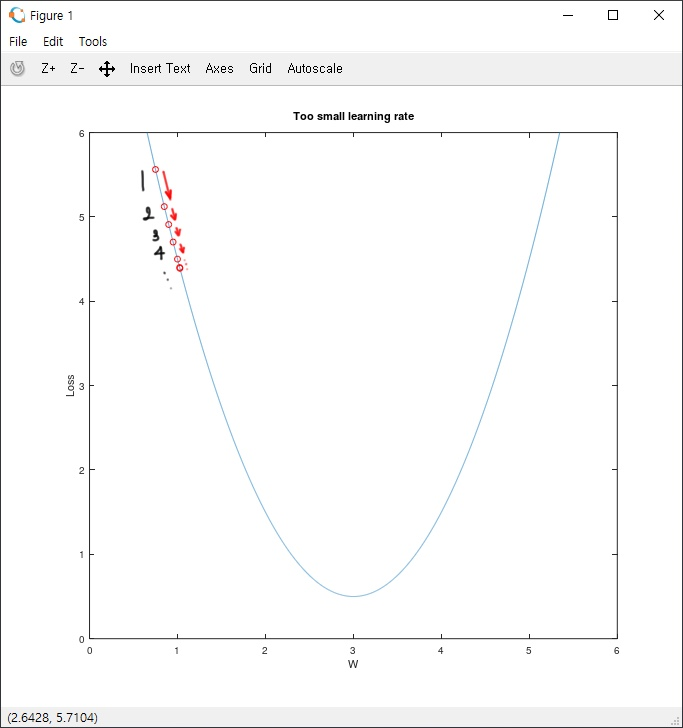 먼저 learning rate가 너무 작은 경우입니다. learning rate가 너무 작으면 아래 그래프 1.2에서처럼 최솟값에 도달하는 데에 너무 많은 학습이 필요합니다. 따라서 최솟값에 도달하기까지 시간이 오래 걸리고, 최악의 경우에는 정한 Epoch 내에 최솟값에 도달하지 못해 지역적 최솟값(local minimum)에서 멈출 수도 있습니다. 이렇게 되면 우리는 이 지역적 최솟값을 전역적 최솟값(Global minimum)으로 착각하여 기대했던 결과와는 전혀 다른 결과를 얻을 것입니다. 결국 learning rate가 너무 작을 때는 단순히 시간이 오래 걸리는 것에 그치지 않고, 결과에 영향을 주어 잘못된 결과를 얻을 수도 있기 때문에 값을 조정할 필요가 있습니다.