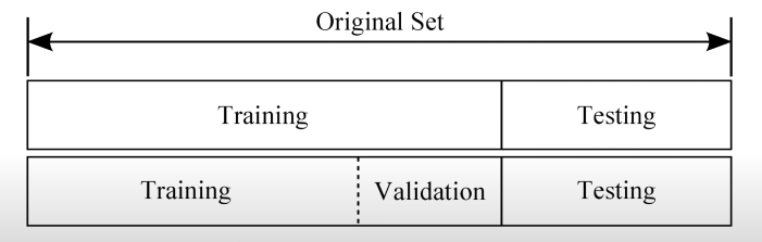 위의 막대는 먼저 소개한 방식대로 Original set을 Training set과 Testing set으로 나누었지만, 아래 막대는 Training set을 다시 Training set과 Validation set으로 나눈 것을 볼 수 있습니다. 이렇게 나눈 Validation sset의 데이터들로 우리는 모델의 learning rate와 Regularization 식의 lambda값을 적절하게 튜닝하여 사용합니다. 이렇게 하는 것은 쉽게 본시험(Testing set으로 모델을 평가) 이전에 모의고사(Validation set으로 learning rate / lambda를 조절)를 치러 조금 더 의미 있는 모델을 만드는 과정이라고 이해할 수도 있습니다.