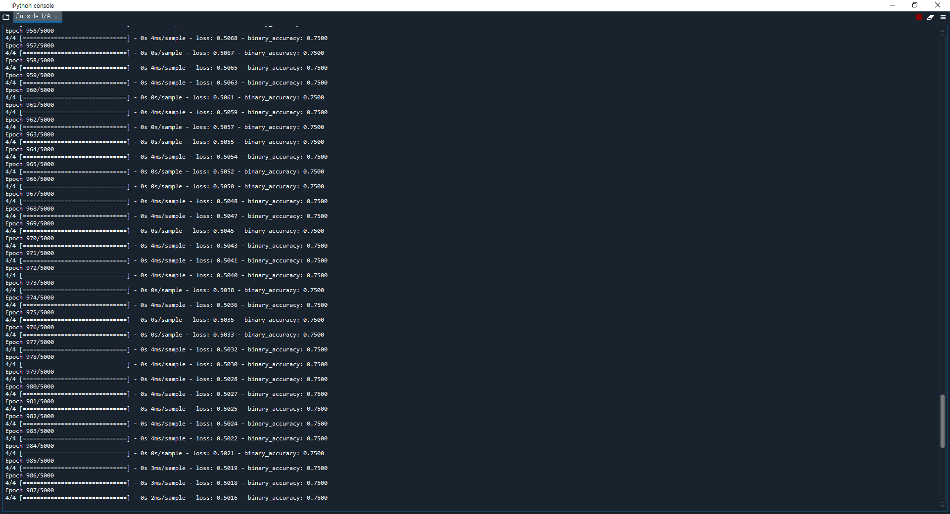 위의 출력 1.1은 학습 중일 때 스크린샷한 결과창이며 아래의 출력 1.2는 학습을 완료한 뒤 스크린샷한 결과창입니다. Epoch에 따라 loss가 줄어들고 binary_accuracy가 증가하는 것을 확인할 수 있습니다. 아래의 학습이 완료된 후의 결과를 보면, loss는 0.0087로 크게 줄고 binary_accuracy는 1.0000으로 정확한 결과를 보이는 것을 확인할 수 있습니다. 아래는 Dense 레이어의 구조를 요약한 모습과 예측 레이블을 출력합니다. XOR 모델에서 기대하는 결과로 학습되었음을 확인할 수 있습니다.