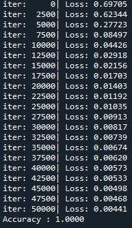 그렇다면 먼저 Tensorboard에 대해 알아보겠습니다. 이전까지 우리는 주로 텐서플로우 코드를 print로 출력하여 값의 변화를 살펴보았습니다. 바로 직전 포스트의 XOR문제 또한 아래와 같이 print로 출력하여 Loss의 변화를 알아보았습니다. 이 방법은 수치적으로 값의 변화를 지켜볼 때는 유용하지만, 변화 추이만을 살펴보고 싶을 때는 숫자도 많아 한눈에 들어오지 않습니다.