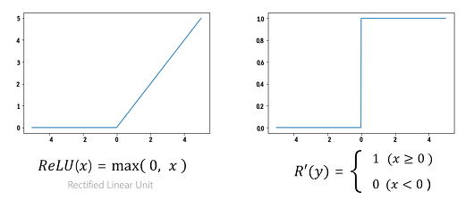 그렇다면 Vanishing gradient가 활성화 함수(Activation function)를 sigmoid로 설정했기 때문에 일어남을 알았으므로 이제 우리는 새로운 형태의 활성화 함수가 필요합니다. 이런 필요에 의해 나온 활성화 함수가 바로 ReLU(Rectified Linear Unit)입니다. 먼저 ReLU와 ReLU의 도함수 그래프는 아래와 같습니다.