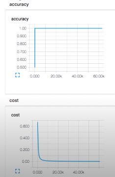 ReLU의 핵심은 0보다 작은 경우는 0을 반환하고 0보다 큰 경우에는 값을 그대로 갖는다는 점입니다. 따라서 최댓값이 1보다 큰 값도 가능하기 때문에 Vanishing gradient를 방지하고 학습이 빠릅니다. 또한 sigmoid와는 달리 도함수가 0 또는 1의 값만을 갖기 때문에 컴퓨터 자원 측면에서도 경제적이라는 장점이 있습니다. 실제로 TensorBoard에서 학습 결과를 확인해보면 accuracy와 cost의 값이 빠르게 변하는 것을 확인할 수 있습니다.