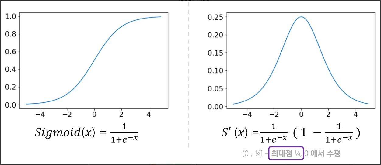 또한 아래 sigmoid의 도함수의 최댓값이 0.25인것을 생각하면 학습망이 깊어질수록 미치는 영향이 줄어들 것임을 생각할 수 있습니다.
