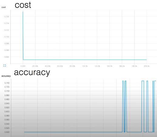 코드를 완성하여 위의 모델을 학습하면 어떤 결과가 나올까요? 불행하게도 원하는 결과를 얻지 못하였습니다.(실행 시 결과 예시는 영상에 있습니다. ) 우리는 Hidden Layer가 많아질수록 많은 학습으로 더욱 정확한 예측을 얻을 것이라 기대했지만, 실제 정확도는 0.5에 그쳤습니다. 아래 TensorBoard에서 cost와 accuracy의 그래프를 보면 cost가 일정 수준으로 떨어졌다가 더 이상 줄어들지 않는 모습을 보이며 accuracy 또한 0.5를 유지하다가 0.75 수준으로 올라갔다 내려갔다를 반복하는 모습을 보입니다.