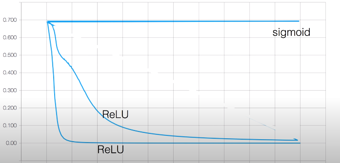 모형을 살펴보면 g = wx일 때 x가 f에 미치는 영향을 알기 위해 ∂f / ∂x를 chain rule에 따라 미분했을 때 ∂g / ∂x = w가 0으로 초기화되어있기 때문에 0의 값을 갖습니다. 따라서 x값에 상관없이 ∂f / ∂x = 0으로 x 그리고 x 이전의 레이어들이 f에 미치는 영향(미분 값)이 모두 0이 됩니다. 따라서 w를 0으로 초기화했을 때는 Vanishing gradient 현상을 피할 수 없습니다. 또 아래의 그래프를 보면 활성화 함수로 ReLU를 사용하였을 때도 cost가 줄어드는 속도가 다른 것을 볼 수 있는데, 이는 weight값을 어떻게 초기화했느냐에 따라 차이가 납니다.