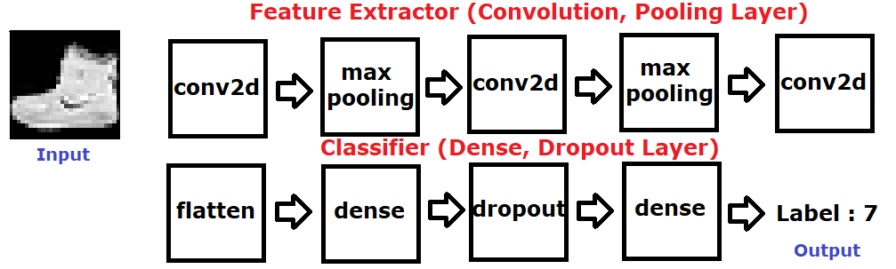 line 66 - 79에서는 Fashion MNIST 분류를 위해 CNN 모델을 정의하고 있습니다. 모델은 Convolution 레이어와 Pooling 레이어를 사용하여 이미지의 특징을 추출하고 Dropout 레이어와 Dense(Fully Connected) 레이어를 사용해 과적합을 방지하고 이미지를 분류하도록 구성했습니다. 아래는 CNN 모델의 구조를 그림으로 나타냈습니다.