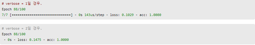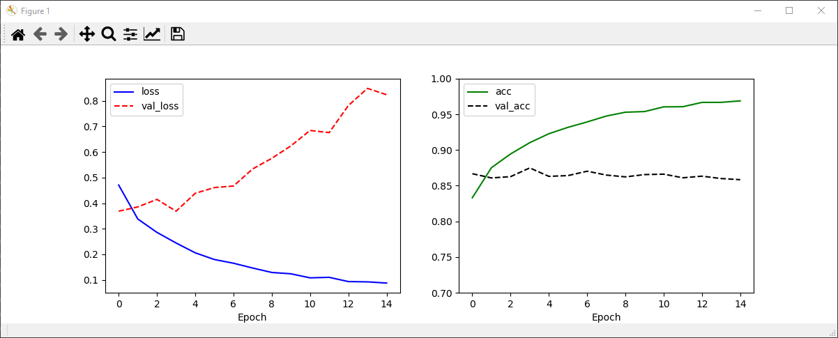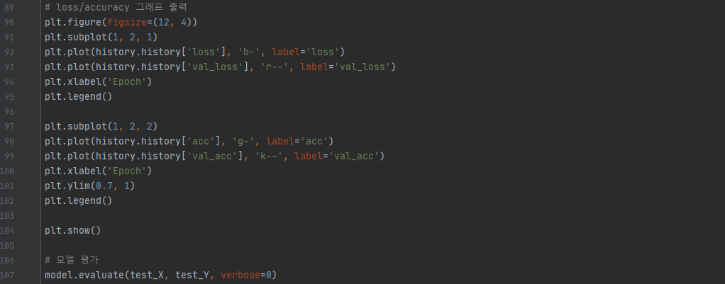 마지막으로 loss와 accuracy 그래프를 출력하고 모델을 평가하는 코드입니다. matplotlib 라이브러리를 이용해 그래프를 그리고 model.evaluate()로 모델을 평가하고 있습니다. 그래프를 그리는 코드에서 loss는 매 에포크 마다의 훈련 손실값, val_loss는 매 에포크 마다의 검증 손실값, acc는 매 에포크 마다의 훈련 정확도, val_acc는 매 에포크 마다의 검증 정확도를 나타냅니다. 위에서 validation_split으로 분류한 검증 데이터가 val_loss와 val_acc의 데이터가 됩니다. 그래프를 그렸을 때 만약 loss는 감소하는데 val_loss는 증가한다는 것은 과적합이 일어났다는 것을 뜻합니다. verbose는 학습 중 출력되는 문구를 설정하는데, verbose=0은 아무것도 출력하지 않으며 verbose=1은 훈련의 진행도를 보여주는 진행 막대를, verbose=2는 미니 배치마다 손실 정보를 출력합니다.