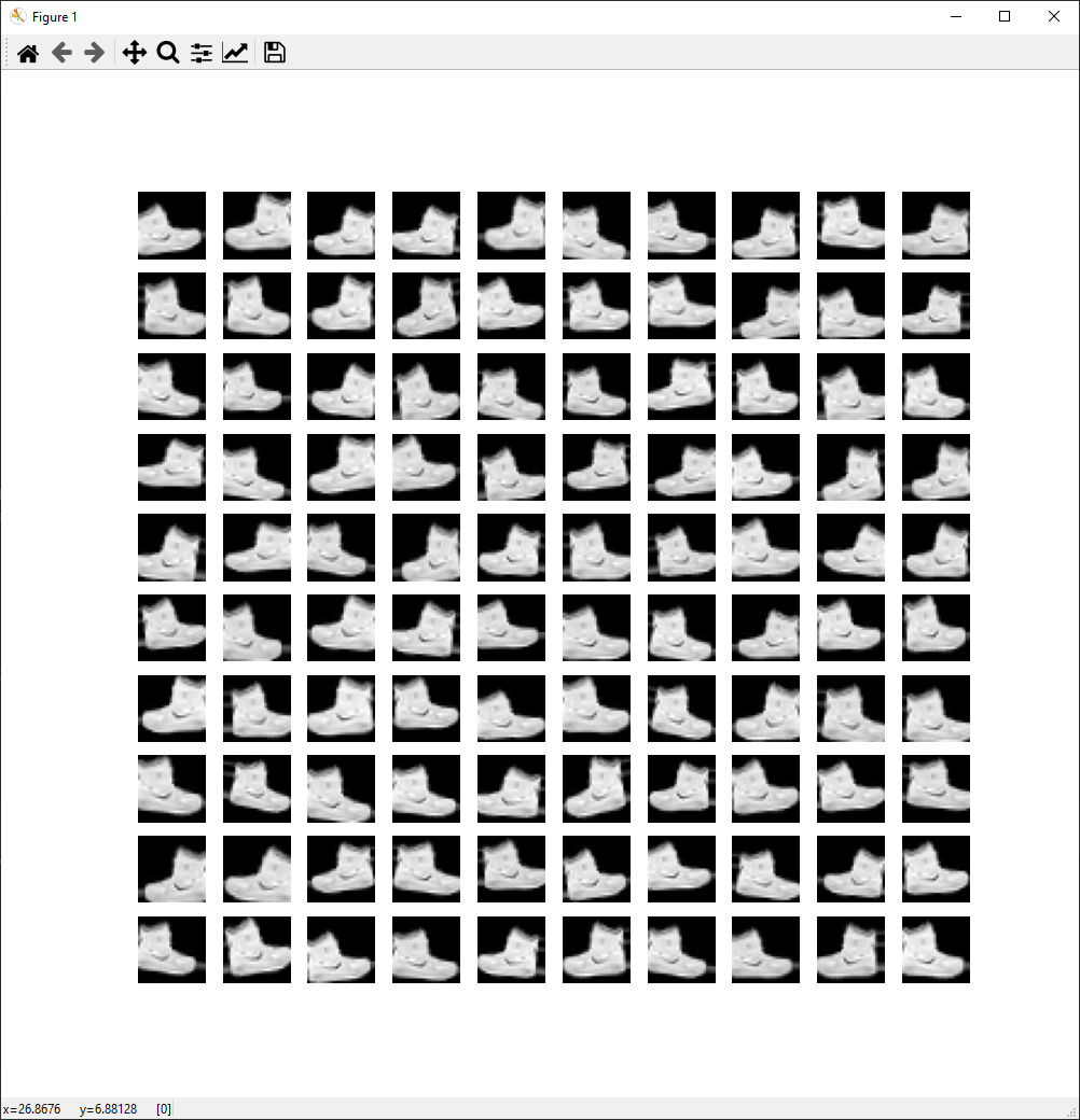 x_augmented = image_generator.flow(np.tile(train_X[0].reshape(28 * 28), 100).reshape(-1, 28, 28, 1),