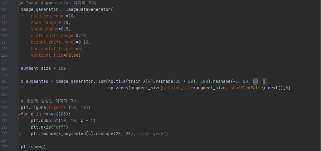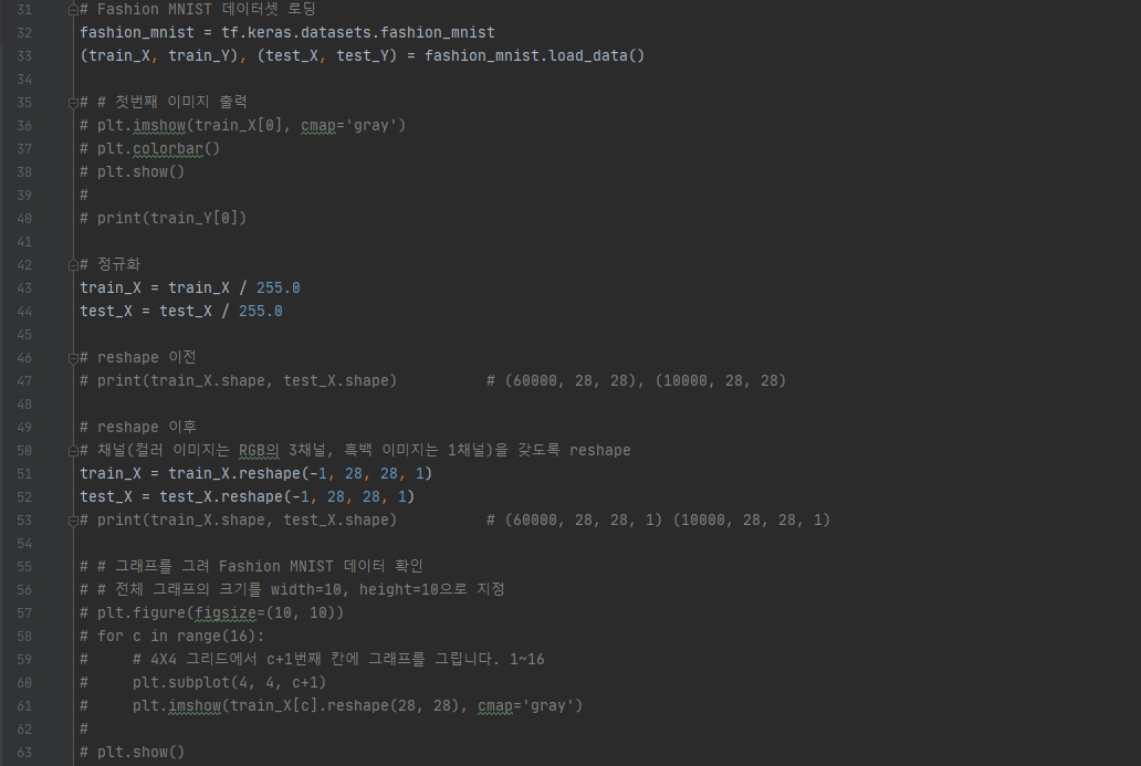 이후 우리는 최댓값과 최솟값을 알고 있기 때문에 이미지 픽셀값을 255로 나눠 0.0과 1.0 사이의 값으로 정규화합니다. 또한 Conv2D 레이어로 연산할 것이기 때문에, 이미지가 채널을 가진 형태로 만들기 위해 reshape해줍니다. 참고로 코드에 주석이 많이 씌어져 있는데, 이미지를 출력해 확인하거나 데이터의 형태를 확인하기 위해 작성한 코드이기 때문에 실제로 작성하실 때는 주석 부분을 지우고 작성하셔도 됩니다. 이제 CNN 모델을 정의하고 학습하는 과정을 살펴보겠습니다.
