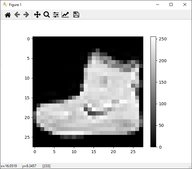Keras에는이미 Fashion MNIST 데이터셋이 탑재되어 있습니다. tf.keras.datasets.fashion_mnist로 Fashion MNIST 데이터셋을 training set과 test set 튜플로 나누었습니다. load_data()는 train_X와 test_X에는 이미지 데이터를, train_Y와 test_Y에는 범주 라벨의 형태를 취한 2개의 튜플을 반환합니다. line 36 - 40의 주석을 해제한 후 실행하면 데이터셋의 첫 번째 이미지를 확인하면 데이터의 이미지가 0에서 255까지의 값을 가지는 28x28 픽셀 크기의 2차원 이미지임을 확인할 수 있습니다.