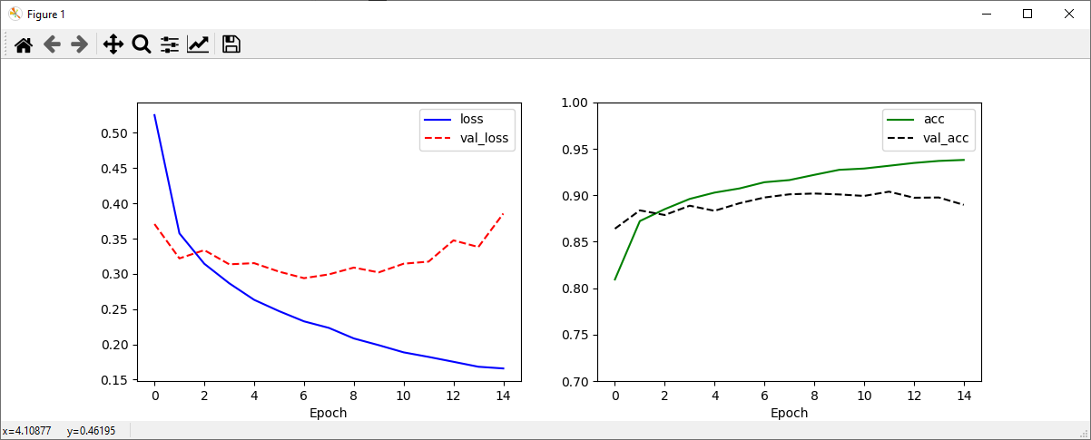 이제 코드를 실행하여 출력화면을 보겠습니다. 먼저 아래의 그래프를 보면 loss는 Epoch에 따라 급격히 줄어드는 반면 val_loss는 줄어들다 늘어났다를 반복하며 0.35와 0.4 사이에 머물고 있습니다. 언뜻보면 과적합이 일어난 상태라고 해석할 수도 있지만, MaxPooling 레이어와 Dropout 레이어를 사용하지 않았을 때에 비하면 훨씬 개선된 수준이라는 것을 알 수 있습니다. loss, accuracy의 최종 결과를 보면 [0.3989..., 0.8932]로, Conv2D와 Dense 레이어만 사용해 해결했을 때에 비해 좋아졌다는 것을 알 수 있습니다. Conv2D와 Dense 레이어만 사용해 문제를 해결한 코드는 따로 작성하진 않지만, 실제로 두 코드를 실행해 결과를 확인해보면 정확도가 0.8577에서 0.8932로 4%가량 높아졌음을 알 수 있습니다. 손실에서는 큰 차이를 보입니다.