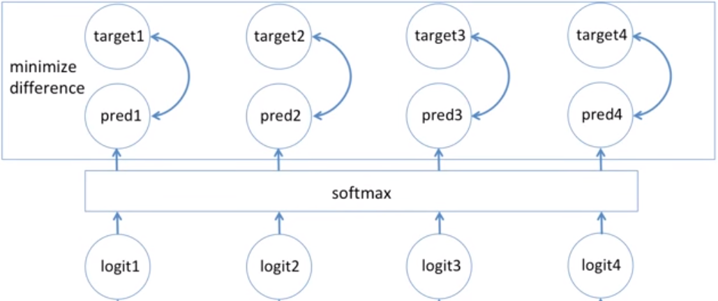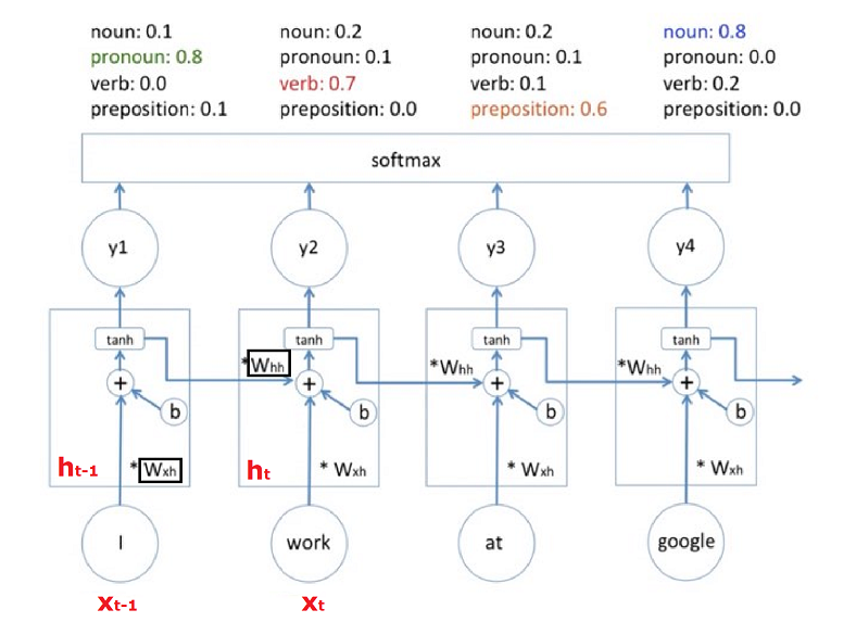 이후 모델은 softmax를 통해 one-hot encoding된 값을 통해 차례대로 대명사, 동사, 전치사, 명사라는 답을 예측합니다. 사실 이 문장에서 i와 at는 대명사와 전치사임을 모델도 이미 알고 있기 때문에 이 단어들이 work와 google에 미치는 영향(각 단계에서의 Whh값)이 어느 정도 유의미해야만 정확한 예측을 할 수 있었을 것입니다. 이후에는 모델의 예측값(아래 그림에서의 pred)을 실제값(target)과 비교하며 w_xh, bias, w_hh를 최적화하여 둘의 차이를 줄여나가도록 학습을 합니다. 이때 주의할 점으로는 RNN은 셀 하나를 가지고 재사용하는 방식이기 때문에 w_xh와 bias, w_hh는 모든 네트워크에서 하나의 동일한 값입니다.