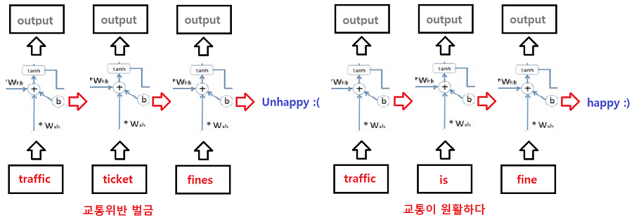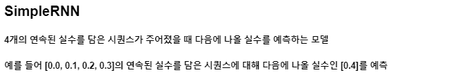 다음 포스트에서 LSTM을 설명할 때 마지막의 문장에서 다음에 나올 단어를 예측하는 모델을 예로 들어 설명할 것이므로, 지금은 많은 문제들을 RNN으로 해결할 수 있다는 것에 대해서만 알고 넘어가겠습니다. 이제 RNN에서 가장 기초적인 구조인 SimpleRNN를 예로 입력이 hidden state에서 계산되어 출력되는 과정에 대해 알아보겠습니다.
