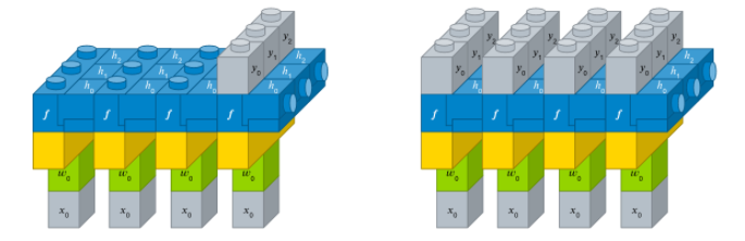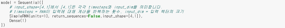 그렇다면 TF2.0버전에 맞추어 Keras에서 SimpleRNN을 구현한 코드는 다음과 같습니다. 실제 keras.layers.SimpleRNN에는 아래의 많은 인자들을 필요로 하지만, 지금 필요로 하는 인자는 반복 횟수와 입력 벡터의 크기를 담은 인자 input_shape와 반환 시 시퀀스 형식으로(one to many, many to many, LSTM 등에서는 True로 사용됩니다) 반환할 것인지를 표현하는 인자 return_sequences만이 필요합니다. 블록 형태로 표현하면 왼쪽이 return_sequences=False일 때, 오른쪽이 return_sequences=True일 때의 모양입니다. 바로 밑에는 출력을 위해 Dense레이어를 연결한 모습을 볼 수 있습니다.