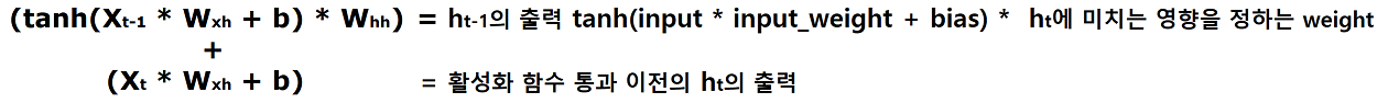 선을 따라 h_t에서의 출력을 살펴보면, 이전 네트워크들과는 달리 h_t-1의 출력을 어느 정도 반영할지 정하는 weight인 Whh과 곱한 값을 h_t의 입력에 weight을 곱한 값과 더하는 것을 볼 수 있습니다. 이를 아래처럼 수식으로도 표현할 수 있는데, 많이 복잡해 보이지만 기존의 네트워크에서 "출력을 정하는 데에 있어 이전의 정보를 얼마만큼 기억할 것인지를 고려"하는 수식이 추가되었을 뿐입니다.