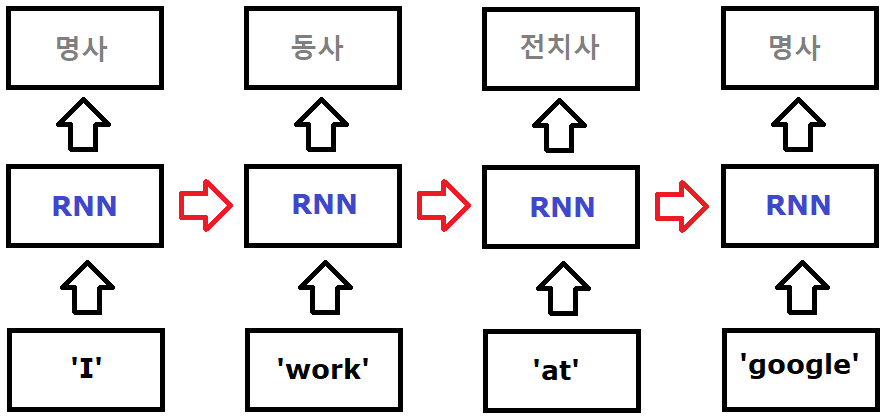 CNN에 이어 이번에는 순환 신경망(RNN, Recurrent Neural Network)과 RNN의 가장 기초인 SimpleRNN에 대해 알아보겠습니다. 먼저 RNN은 음악, 자연어, 주식 시장 등 시간의 흐름에 따라 변화하는 시퀀스(순서가 있는) 데이터를 입력받아 처리할 때 사용됩니다. 하나의 예로 여러 단어들이 주어졌을 때, 이 단어들을 조합해서 만든 문장의 품사를 맞추는 프로그램을 생각해보겠습니다. 예시를 들어 i, google, at, work의 네 단어가 주어졌을 때, 'i work at google(나는 구글에서 일한다)'와 'i google at work(나는 직장에서 구글링을 한다)'의 두 문장을 만들 수 있습니다. 이는 google과 work 단어 둘 다 명사의 뜻과 동사의 뜻이 있으며, 서로 동사-명사, 명사-동사로 쓰여도 전혀 어색하지 않기 때문입니다. 따라서 두 문장에서 google과 work가 명사인지 동사인지는 앞 뒤 단어의 품사 혹은 문장 성분이 중요합니다. 아래 그림을 보겠습니다. I work at google에서 work는 I라는 대명사 뒤에 나왔으므로 동사로 사용되었습니다. 반면 google은 at 뒤에 나와 구글이라는 장소를 의미하는 명사로 사용되었습니다.