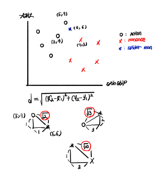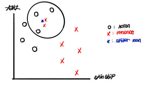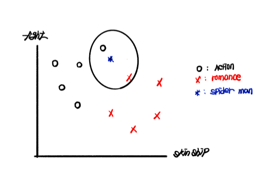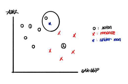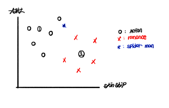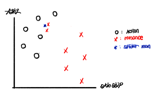 예를 들어 영화 스파이더맨: 노 웨이 홈이 액션 영화에 포함되는지, 로맨스 영화에 포함되는지 알아보고자 합니다. 우리는 이미 많은 액션 영화와 로맨스 영화를 보고서 해당 영화들의 스킨십 횟수와 싸우는 횟수를 데이터화 했다고 하겠습니다. 이를 토대로 그린 아래의 그래프에서 X축은 skinship count, Y축은 fight count, 로맨스 영화는 x, 액션 영화는 o, 스파이더맨은 *입니다.