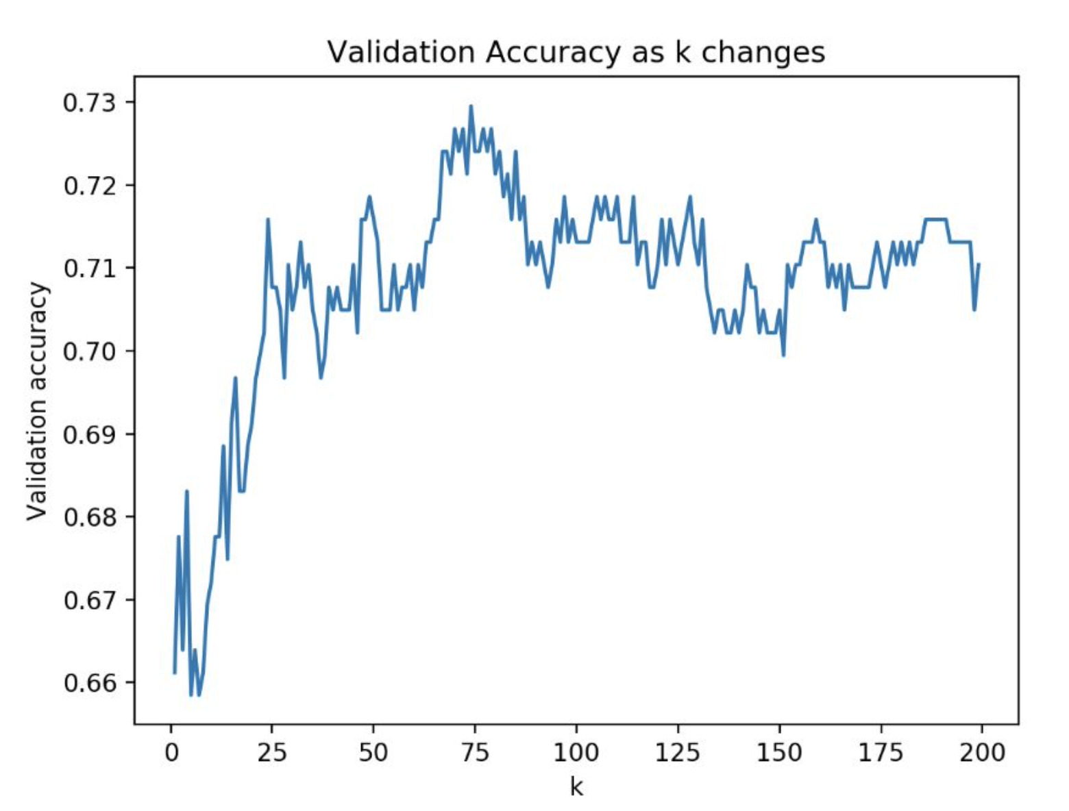 그렇다면 k값이 클수록 좋은 것일까요? 그렇다고 할 수는 없습니다. k값이 과도하게 크다면, under fitting(과소 적합)의 문제가 발생합니다. 위의 그림에서 학습 데이터들은 액션 영화 6개, 로맨스 영화 7개로 13개입니다. 이때 극단적으로 k = 13(13이 큰 수는 아니지만, 현재 예시에서는 데이터 세트 전체에 해당하는 수입니다)으로 설정한 다음 학습한다면, 학습 데이터 간의 거리가 무시된 채 데이터 수가 많은 로맨스 영화로 예측될 것입니다. 이렇듯 분류기가 학습 데이터들의 특징을 반영하지 못한 채 학습하는 것은 지양해야 합니다. 그렇다면 k는 얼마로 두고서 학습을 진행하는 것이 좋을까요? 물론 데이터들의 수, 데이터 고유의 특징 등에 따라 다르지만 검증 데이터만을 넣어 분류 정확도를 측정한 한 모델에서는 아래의 그래프에서처럼 k는 75 근처에서 괜찮은 정확도를 보입니다. 또한 그래프에서 k가 25 미만 일 때는 over fitting의 문제로 정확도가 현저히 낮으며, 75를 지나면서도 under fitting의 문제로 정확도가 낮아지는 추이를 보이고 있다는 점입니다.