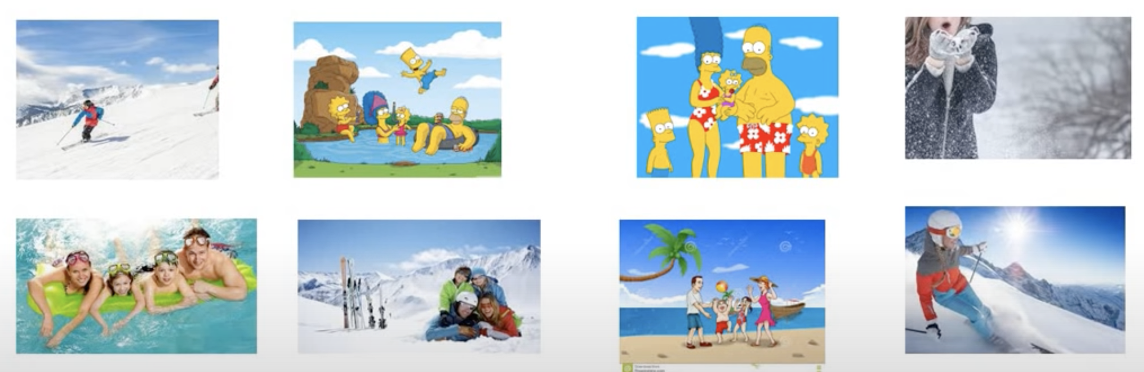 1. 컴퓨터에게 무엇을 해야 하는지를 알려줘야 합니다. 이 과정에는 define problem(겨울에 찍은 가족사진 찾기)과 collect training data(train data로 8개의 사진 모으기)이 포함됩니다. 위의 설명대로 겨울에 찍은 가족사진을 찾는 문제 상황을 정의하고, 훈련 데이터로 사용될 데이터들을 모읍니다. 현재 8장의 훈련 데이터 사진이 있으며, 이 중 겨울에 찍은 가족사진을 찾는 것이 컴퓨터에게 요구됩니다. 왼쪽 위에서부터 1, 2, 3, 4, 왼쪽 아래에서부터 5, 6, 7, 8이라고 하겠습니다.